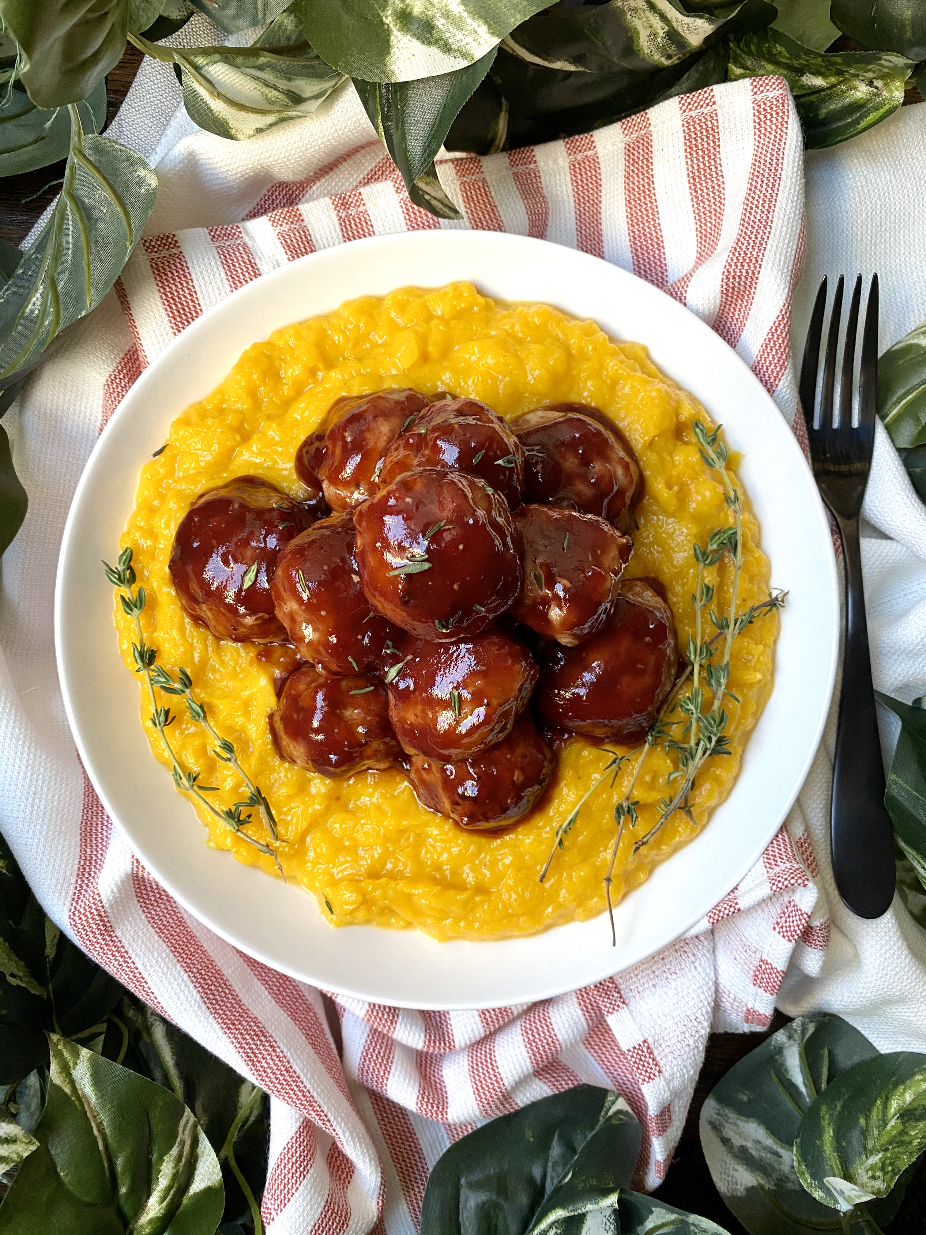 Smoky Cranberry Glazed Meatballs Over Butternut Squash Mash